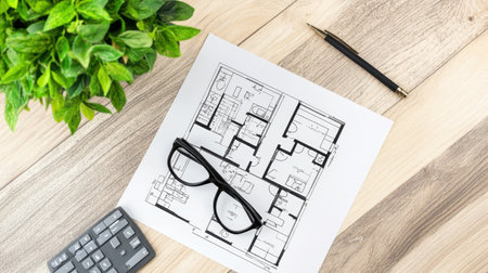 This image showcases a detailed architectural blueprint on a wooden desk, accompanied by glasses, a calculator, and a small green plant, ideal for home design and planning concepts.