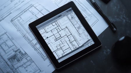 A sleek digital tablet displaying an architectural blueprint rests atop detailed paper plans, showcasing a blend of technology and traditional design in a professional workspace.