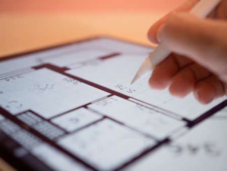 An architectural engineer is working on a floor plan of a building on a mobile