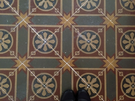 Selfie of woman's shoes on blue ceramic tile floor background.