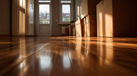 A warm and inviting interior featuring glossy wooden flooring reflecting sunlight. The serene atmosphere is enhanced by natural light streaming through windows, creating a cozy living environment.