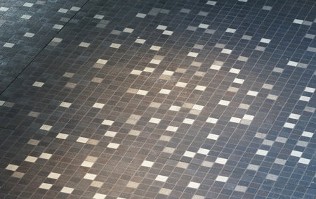White tiled pattern with reflective lights in perspective.