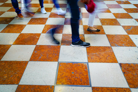 Walking, feet and legs blurred moving across orange and white check patterned marble floor in Europe.