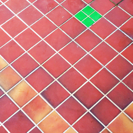 One Green Tile on Red and Orange Tiled Floor. Ceramic Tiles Floor for Kitchen or Bathroom. Abstract Architectural Background.