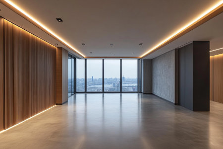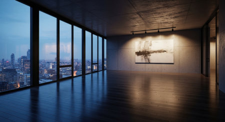 Spacious empty modern room with floor to ceiling windows offering a panoramic view of a city skyline at twilight. dark wooden floor reflects the urban lights, complemented by an abstract painting on a concrete wall.