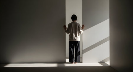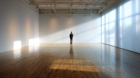 A person stands alone in a large empty room with wooden floors and shadows on the walls. Light streams in, creating contrast and depth.