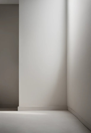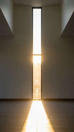 Serene and minimalist architectural interior with a dramatic light beam from a high window