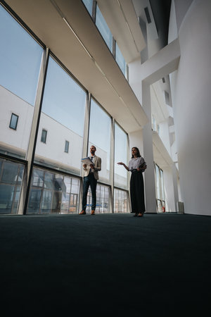 Two colleagues stand in a modern glass atrium, presenting and discussing plans during a business meeting