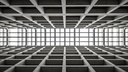 Low-angle view of a building's interior, showcasing the interplay of architectural elements, including a cross-shaped arrangement of beams and windows. The image highlights the structural design and the play of light filtering through the windows.