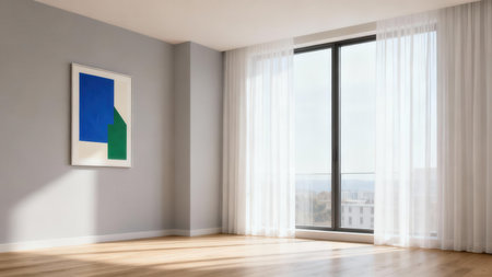 Contemporary corner room featuring light gray walls, sunlit wood floor, and a tall picture window draped with sheer white fabric, highlighted by a bold blue and green geometric artwork.