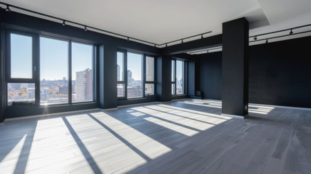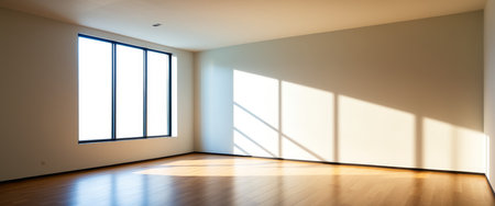 Empty room. Interior space, with shadows reflected by the bright daylight coming through the windows. Generative AI