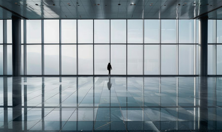 High-tech building interior with glass walls, polished floors, walking silhouette, soft light, minimalist design.