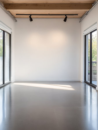 Bright spacious room featuring large windows that allow natural light to flood in. The minimalist design emphasizes clean lines and an open feel perfect for various activities.