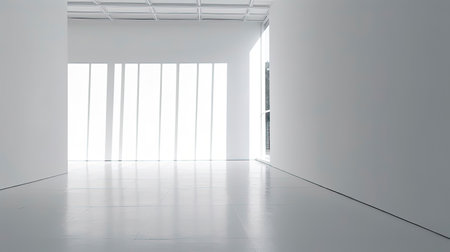 This image captures a bright, empty interior with minimalist design, featuring smooth white walls, expansive windows letting in ample sunlight, and a neutral color palette, ideal for modern