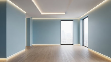 An empty modern room with light blue walls, a light wood floor, and subtle ambient LED lighting along the walls and...