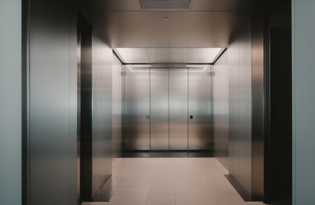 Interior of an office building with elevator and elevator doors, wide angle view