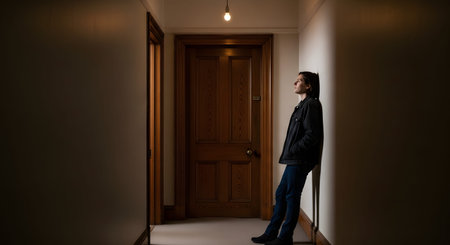 A person stands leaning against a wall in a dimly lit hallway next to a closed wooden door. The solitary figure looks upward, illuminated by a single overhead light bulb, evoking a sense of waiting or contemplation.