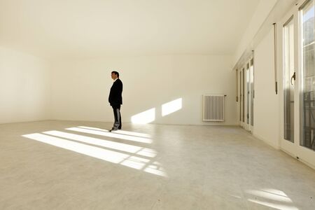 Man standing in an empty room with a window in the background.