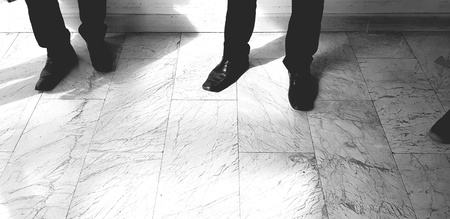 Many men's leg wearing black slacks or long trousers and black leather shoes and standing on the marble floor with sunlight and copy space in black and white - Business form or Man and Waiting concept