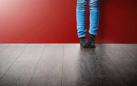 mens legs are dressed in blue denim pants and work in brown rough winter autumn shoes. Shabby old vintage original light beige wooden striped floor background.