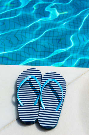 Beach slippers on border of a swimming pool - holiday tropical concept