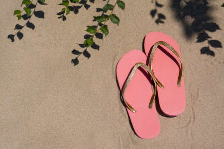 flip flops with gradient color on beach sand with palm tree shadow and space for text. summer time. 3d render