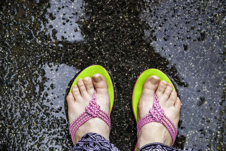 Legs of a man in black flip flops stand on a tiled floor texture background, top view.