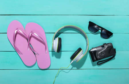 Minimalist travel layout. Flip-flops, white camera, air plane and sunglasses on mint blue background. top view. flat lay