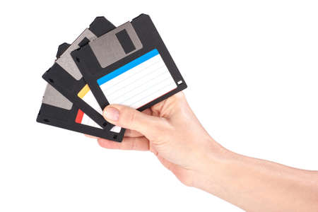 Hand holding floppy disk on white background
