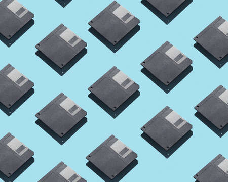 Black and colored floppy disks on blue background. Computer technology 80s.