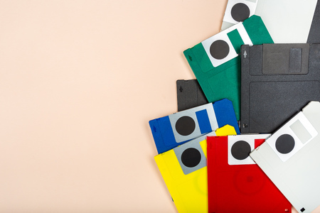 Multicolored floppy disk 3.5 for old computers. background.