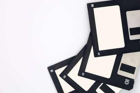 Whole plane with white background of stack of colored floppy disks, grey, black and blue.