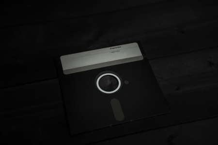 Closeup of a 3.5 inch floppy disk. Vintage computer items. Retro.