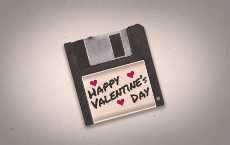 A retro Valentine's Day themed old black aged floppy disk illustration background with copy space