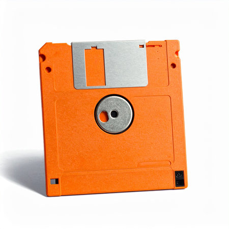 A bright orange 3.5 inch floppy disk with a silver metal shutter is shown against a clean white background.