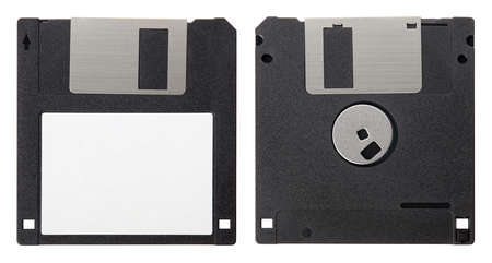 Black floppy disk, front and back with blank label isolated on white background
