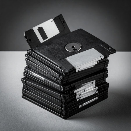 A dramatic black and white studio shot of a stack of vintage 3.5-inch floppy disks.