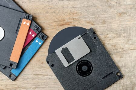 Used floppy diskettes on wooden background.