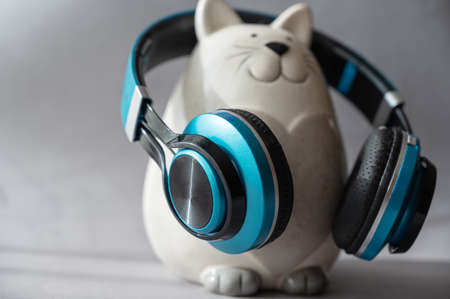Black and turquoise headphones and piggy bank on a gray background. Wireless device for listening to music and communication. Ceramic piggy bank in the shape of a cat. selective focus.