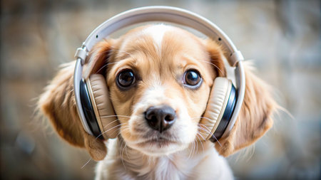 A close-up shot of a brown and white dog wearing headphones. The dog is looking at the camera with a curious expression.