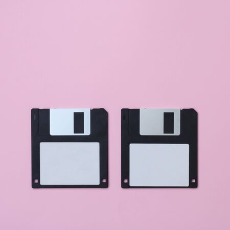 Two black floppy disks on a pink background.