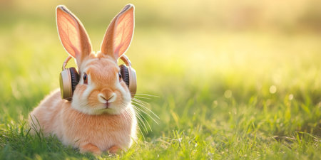 Adorable Rabbit Enjoying Music with Headphones in Sunny Meadow.