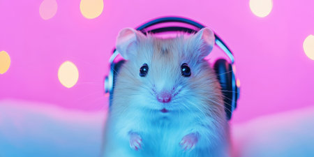 Cute Mouse Listening to Music with Headphones on a Vibrant Pink Background.