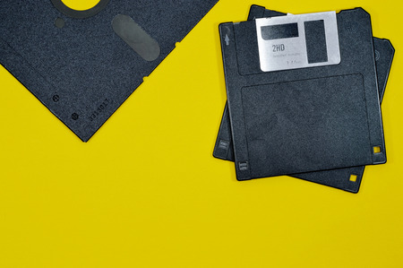 Old floppy disks for computer on yellow background