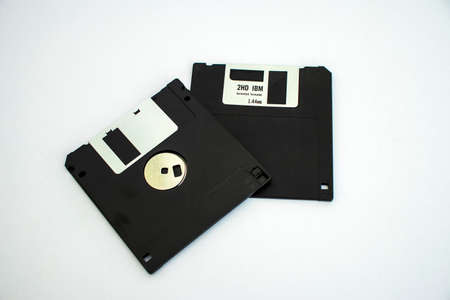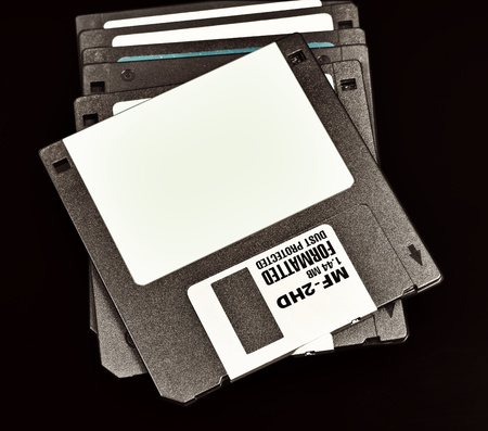 Old floppy disks on white background. Indoors