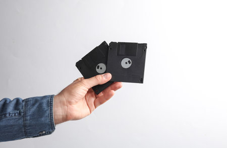 Man's hand in denim shirt holding floppy disks on gray background