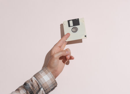Man's hand in shirt holding white floppy disk on beige background with shadow