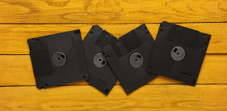 Vintage black floppy disks on a yellow wooden background. Top view