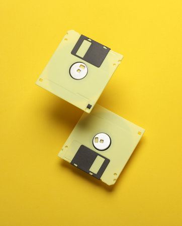 Floating retro 80s floppy disks on yellow background. Conceptual pop, creative layout