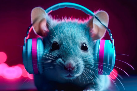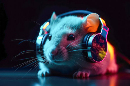 Mouse in headphones lessening music. Generative AI.